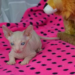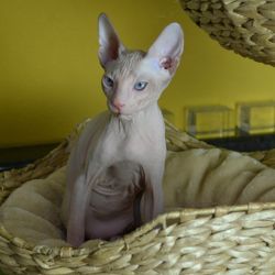 This combination was very success, the skin of kitties isn’t gummy for touch, but fuzz overhanging from their skin creates comfortable chamois, some of the kittens are softly feathered. They are called impregnated cats. Kitty like this will born feathered like a housecat, but in first weeks of her life, the gene inherited from both of parents, will start falling of the long fuzz. From “ugly duckling” we have a “beautiful swan”. Advantage of these fuzzy – flocky cats against gummy is radical in their resistance with regard to illness. Skin isn’t oily, cat takes care about herself, frequent bathing isn’t necessary. They don’t nuzzle to pillows or seats. Soft fuzz will absorb their natural grease. Spot near eyes is clearly, the problem with infection near eyes is not problem now. Flocky cats have long and strong vibrissae, one of the most important tactile apparatus. For Don Sphynx with flock type of fuzz is shining coloration typical. For breeder who observes growth and progress on his cat, is full of expectation from any change-over of his kitty. It’s not probable that siblings will be same. Our kittens might be absolutely naked or with soft velour. We depend on our kitties, when we crossbreed, we focus to achieve beautiful big open eyes, without any eye problem. We want to achieve that their fairness will be more shining, broader head, cat with more muscle figure and taller elegant legs.